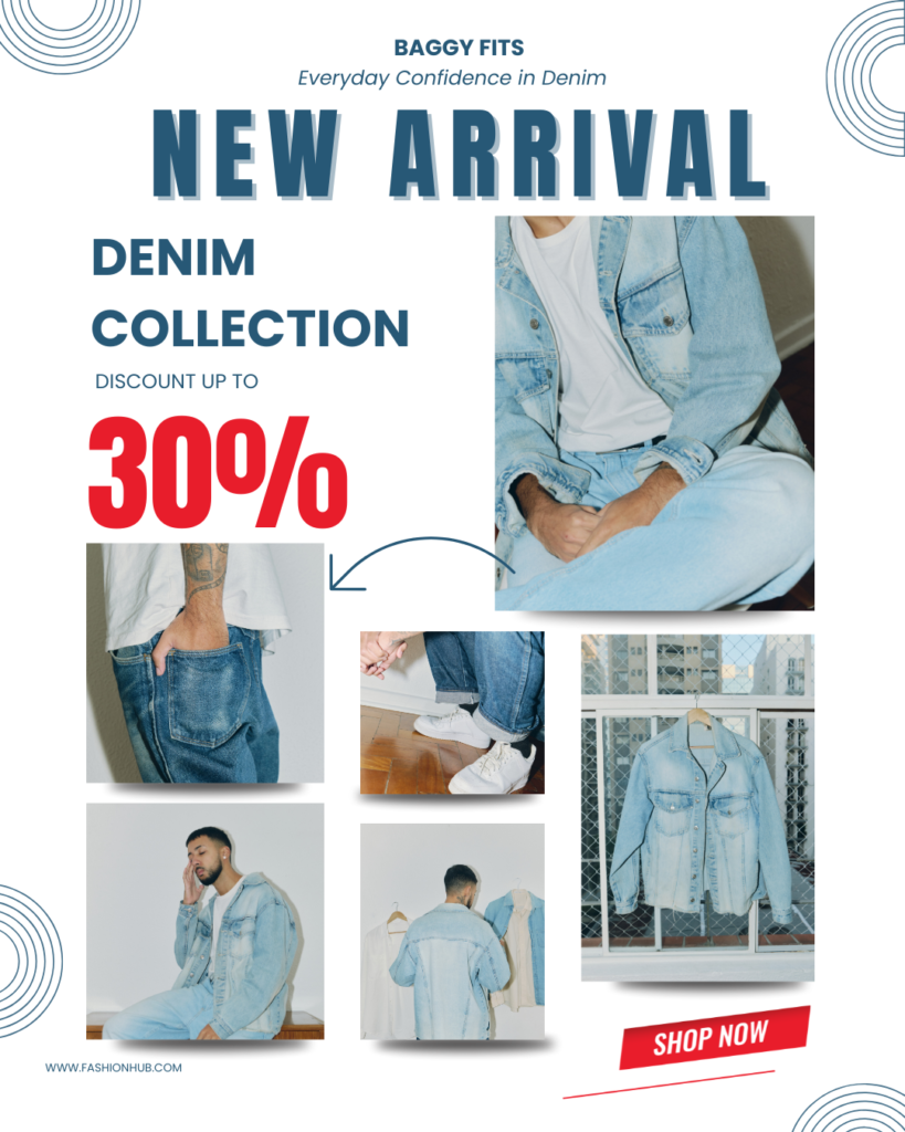 Minimalist Hero Banner: Bold typography across a clean background, with a single denim outfit shot. The tagline becomes the centerpiece.